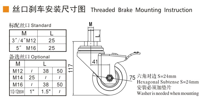 EDL Medium 3" 90kg Threaded Iron Dual Brake Ethylene Rubber Caster 50143L-573-37