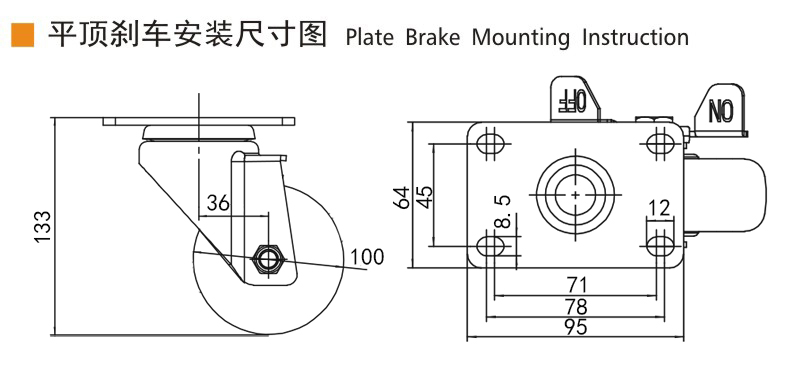 EDL Medium 4" 110kg Plate Side Wheel Brake Ethylene Rubber Caster 50124C-574-37/C