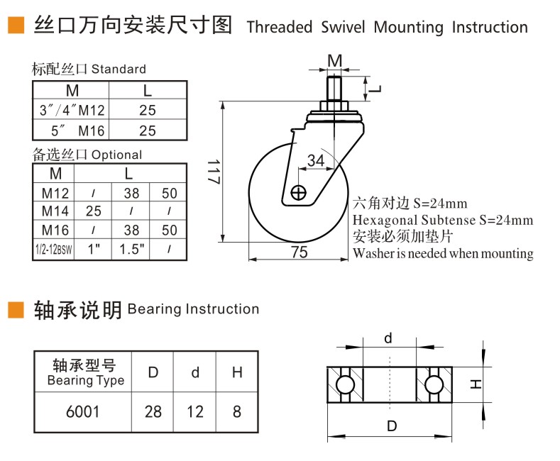 EDL Medium 3" 150kg Threaded Swivel TPA Caster 50133-503-26