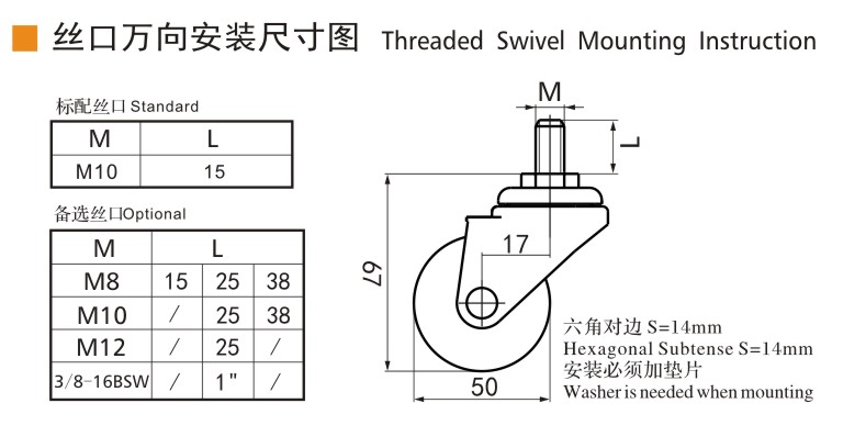 EDL Mini 2'' 30kg Threaded Swivel TPU Caster 20132-202-82
