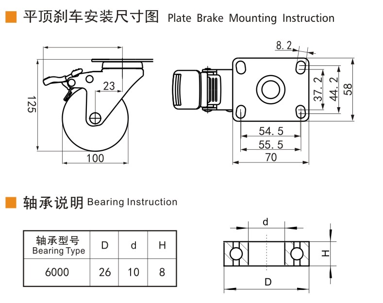 华体会网信誉好25 轻型4英寸70kg平顶塑双刹高强度聚氨酯TPU脚轮36124H-364-84